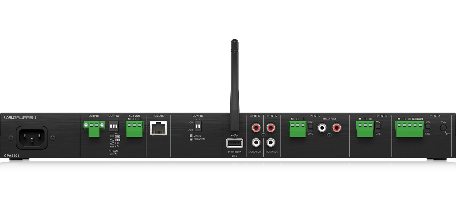 Ενισχυτής 240 Watt με λειτουργία Low-Z (4/8 Ohm) and High-Z (70/100 V). 5 εισόδους (3 Mic/Line & 2 Line), Bluetooth & USB Media Player